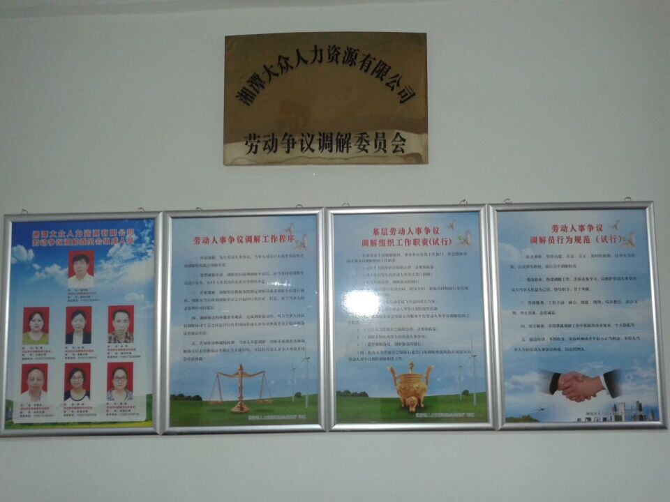 為了規(guī)范勞動人事爭議預(yù)防調(diào)解處理工作,維護社會和諧穩(wěn)定,按照潭人社發(fā)【2014】29號文件要求,根據(jù)《中華人民共和國勞動爭議調(diào)解仲裁法》等法律法規(guī)精神,湘潭大眾人力資源有限公司于2014年6月13日調(diào)整規(guī)范了勞動爭議調(diào)解委員會,并對委員會成員、工作程序、工作職責、行為規(guī)范進行了上墻公示。